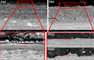 (a)圖(tu)中氧化膜經(jing)過激光清(qing)洗后被移除干凈,圖(tu)(b)所示;(b1)(b2)為激光清(qing)洗后不同位置清(qing)洗效(xiao)果(guo)的高倍放(fang)大(da)圖(tu),改工藝(yi)下激光清(qing)洗后未(wei)觀測(ce)到殘留的氧化膜。